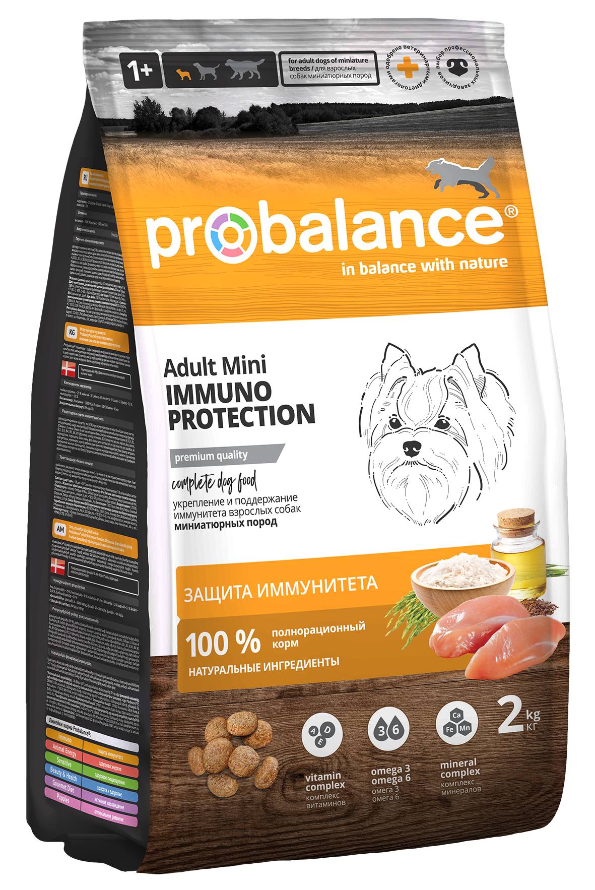 - Probalance Immuno Adult Mini – это вкусный натуральный рацион на каждый день. Сертифицированное питание для собак без искусственных компонентов и Е-консервантов.