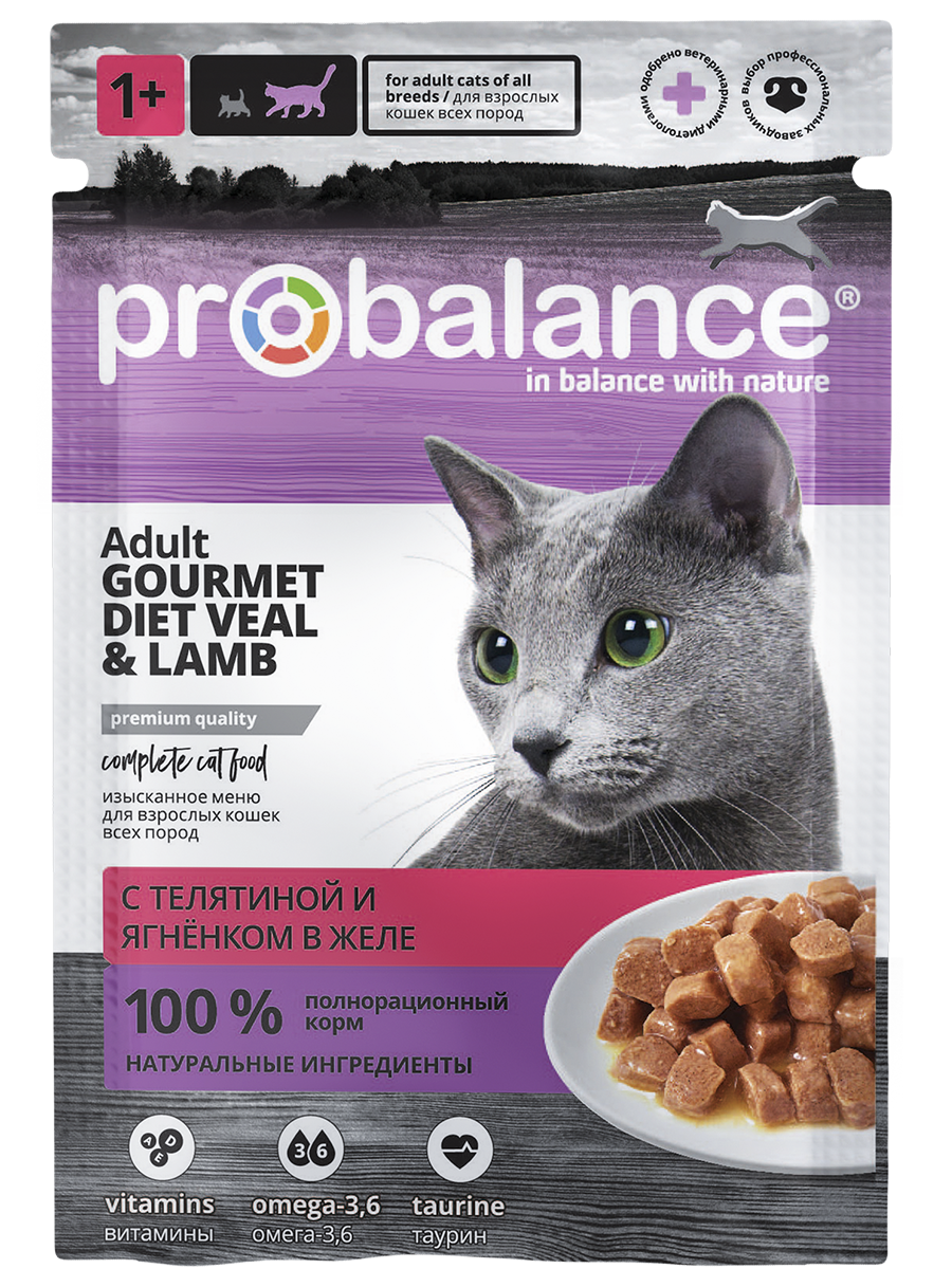Бренд Probalance Форма упаковки Паучи Вкус Телятина и ягненок Основные ингредиенты Мясо и мясные субпродукты не менее 30% (в т. ч. телятина, ягненок), растительные компоненты (в т. ч. злаки, горох), рыба и рыбные субпродукты, протеины животного происхождения, минеральные вещества, загуститель, витамины и микроэлементы, масло льняное, сахара, пребиотик. Содержит таурин. Энергетическая ценность, ккал / 100 г 85 Белок 8 Жир 5 Гарантируемые показатели Протеин – 8%, жир – 5%, зола – 2,5%, клетчатка – 0,5%, влажность – 81%, кальций – 0,2%, фосфор – 0,16%, таурин – 0,04%, витамин А – 230 МЕ, витамин Д3 – 7,7 МЕ, витамин Е – 1,5 МЕ. Срок годности 24 месяца Условия хранения от -18 до +25