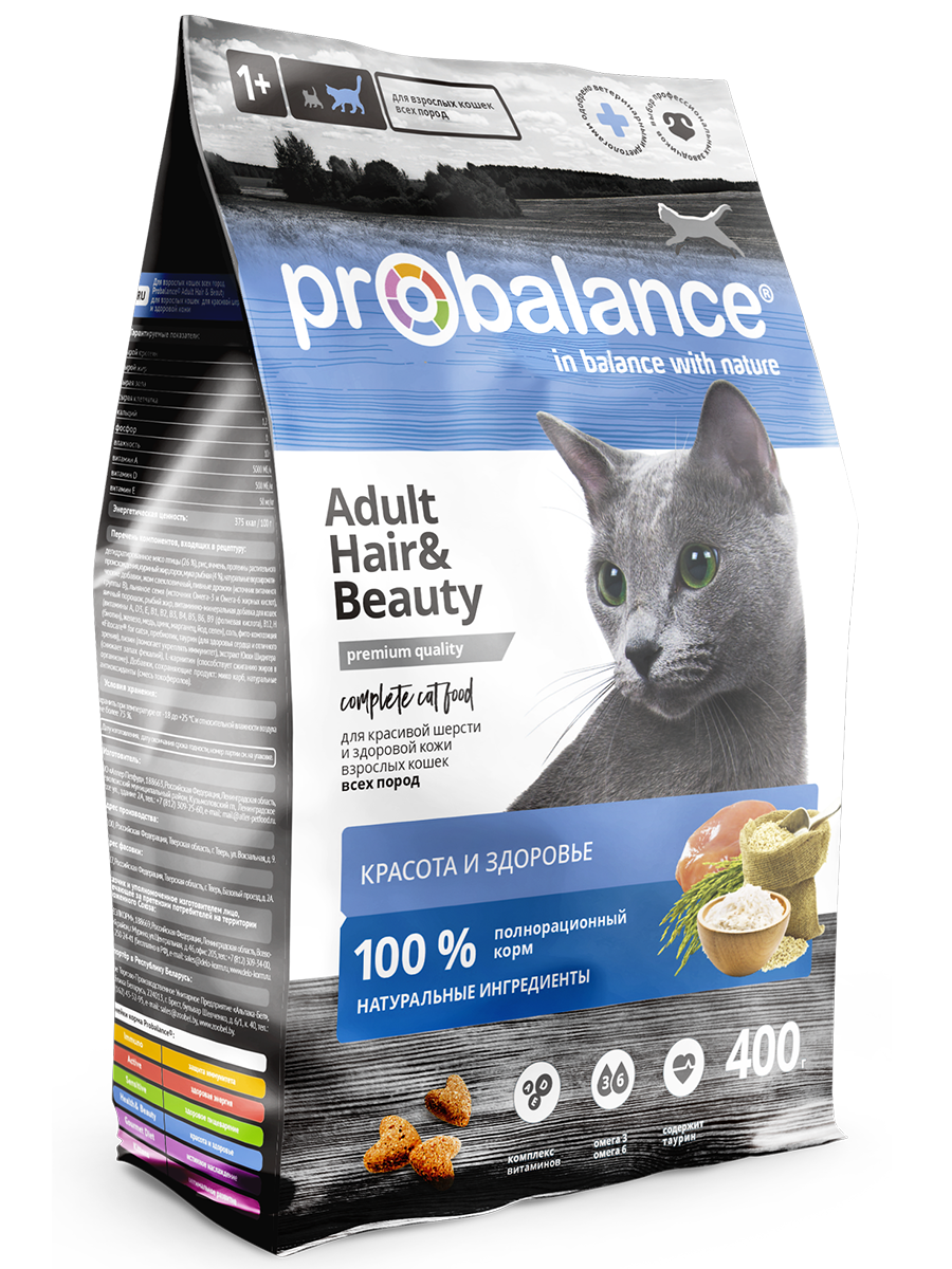 Корм Probalance Beauty разработан датскими ветеринарами для улучшения внешнего вида шерсти и кожи питомца. При ежедневном кормлении шерсть животного приобретает естественный блеск, исчезают шелушение и сухость кожи.