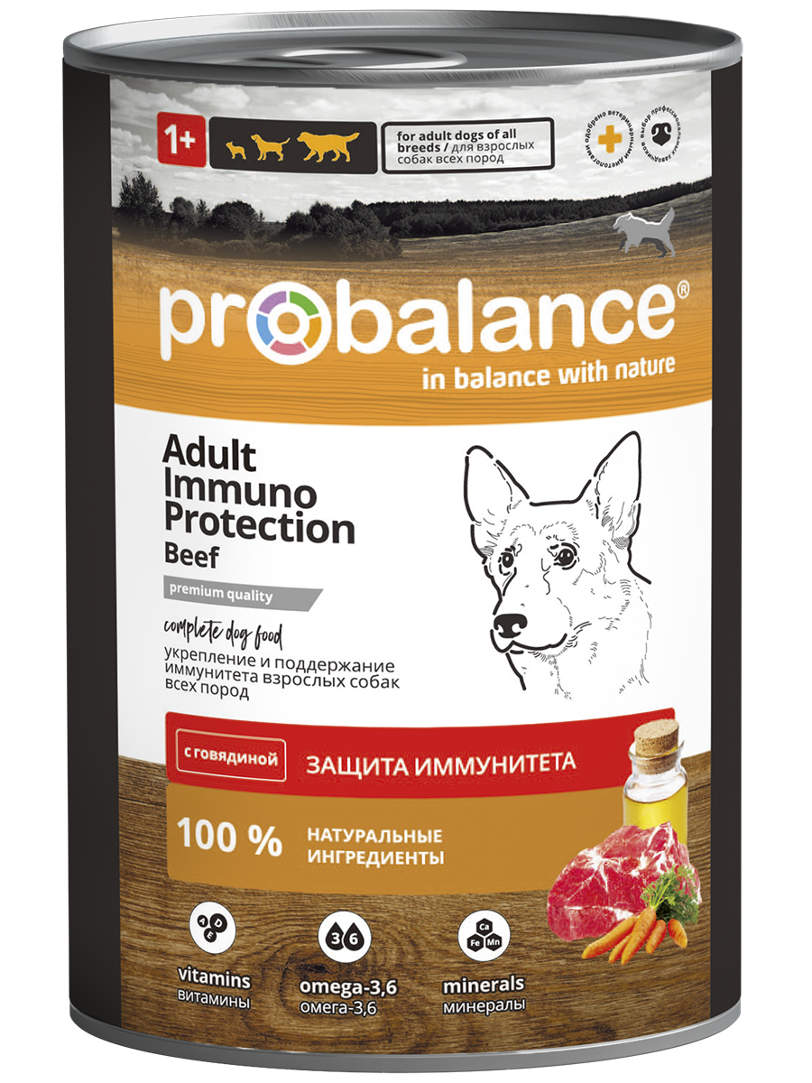 Полнорационный сбалансированный консервированный корм премиум класса для собак с функцией защиты иммунитета. Рацион рекомендован для ежедневного кормления взрослых собак всех пород.