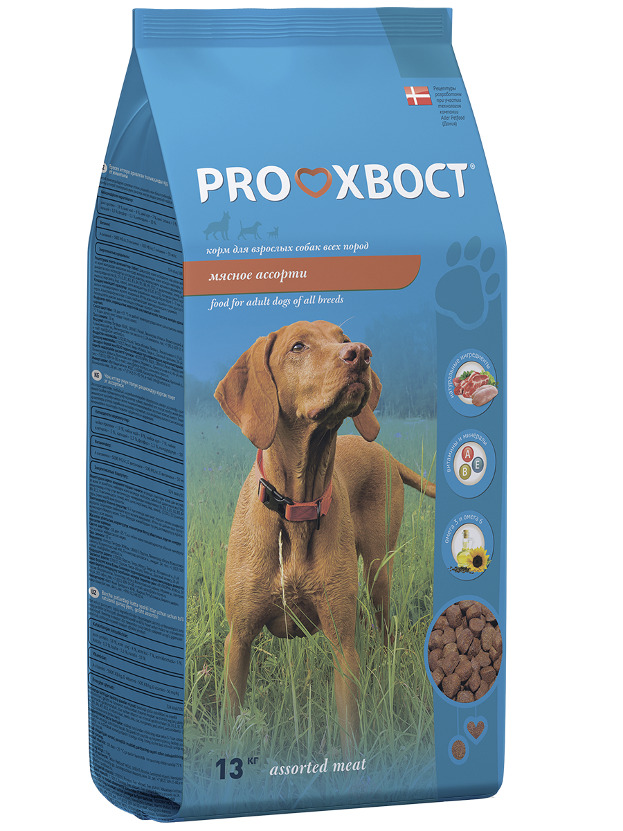 Proхвост «Мясное ассорти» – это полнорационный сбалансированный сухой корм для собак. Рацион подходит для ежедневного кормления взрослых собак всех пород.